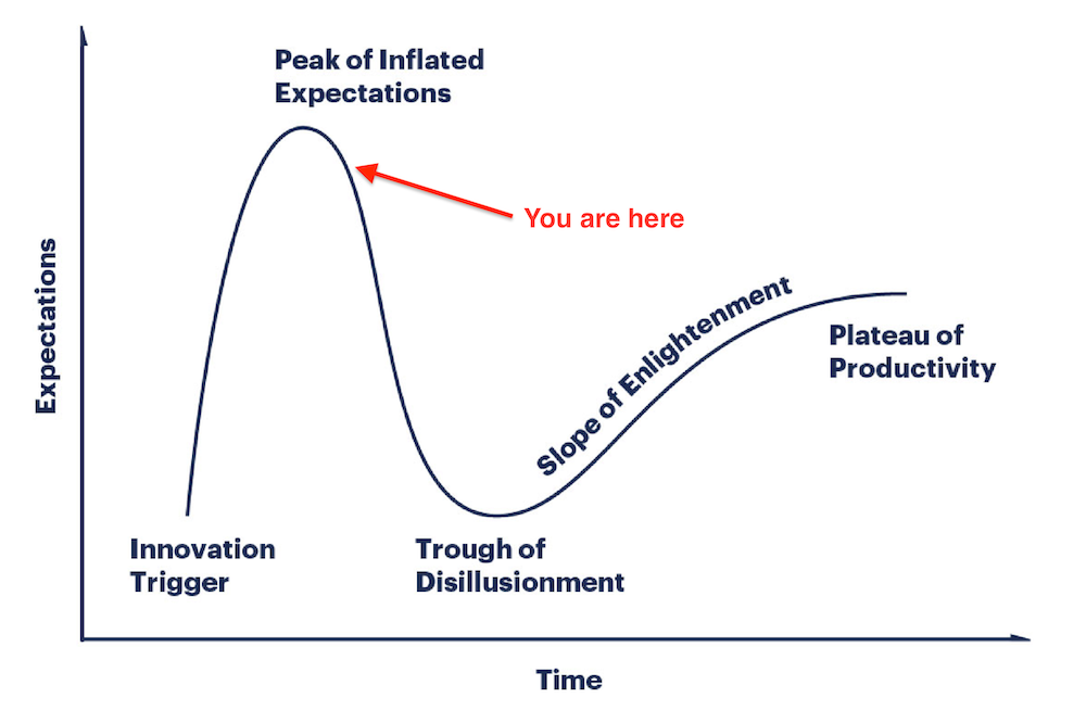 As a result, the AI boom will most likely collapse in spectacular fashion. This is not to say it is a failure. After the crash, good applications of the technology will rise from the ashes, and eventually what has been a punchline will be useful in the long run. But the actual application of the technology will never match the hype. This has been coined the Gartner Hype Cycle, and we're in the midst of the hype peak, and very soon starting the rapid descent.